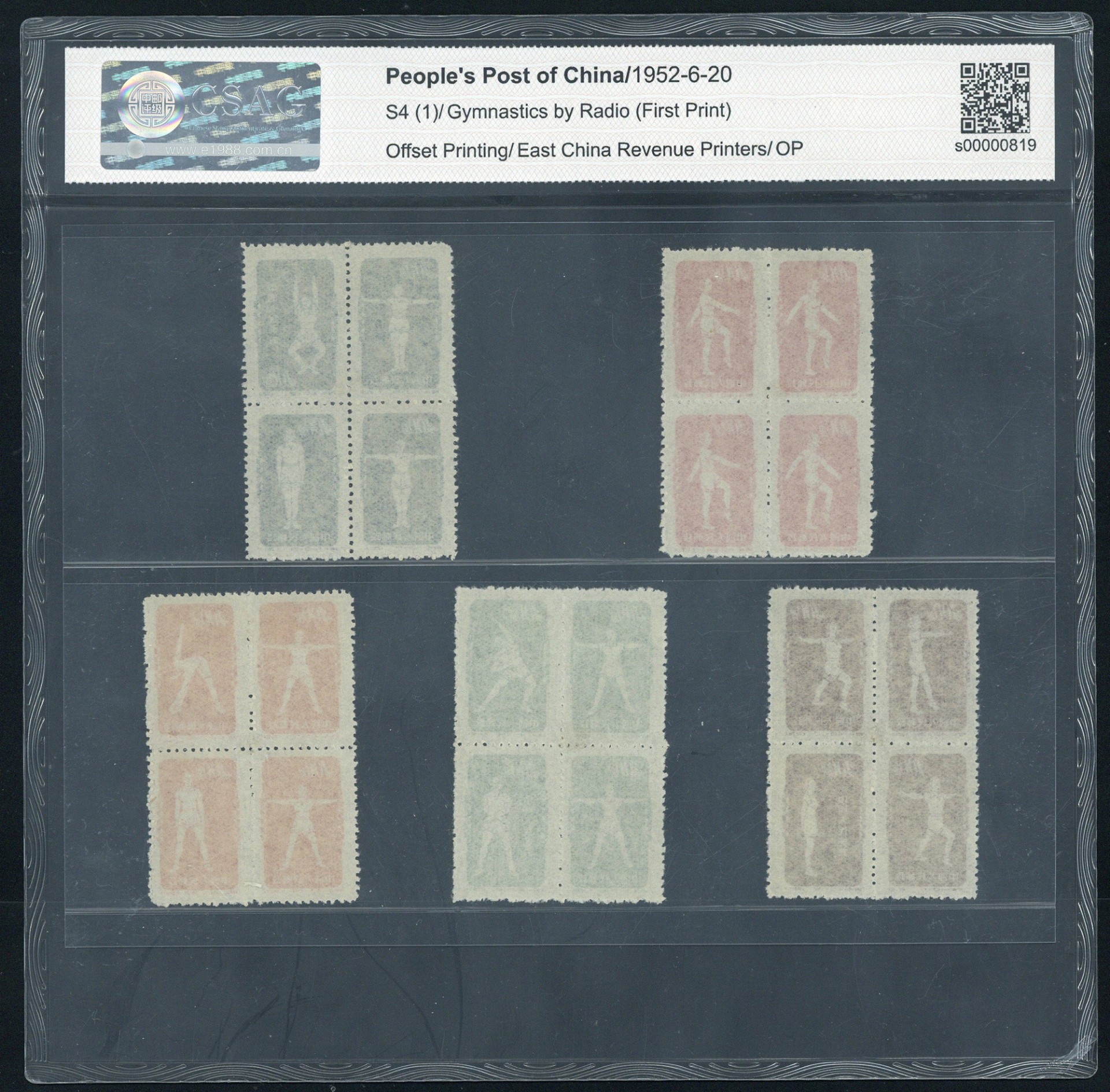 为宣传推广我国的广播体操活动,邮电部发行这套《广播体操》特种邮票。全套40种,每种邮票为一个体操动作,每个四方连为一节体操动作,每个四方连为一节体操动作,全套共10节印成10个四方连,恰似这套广播体操动作的小型分解图。